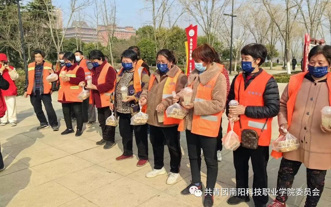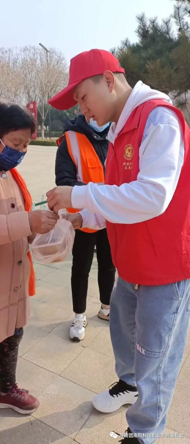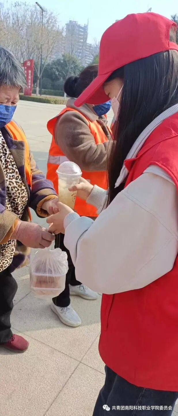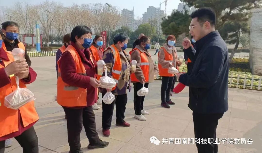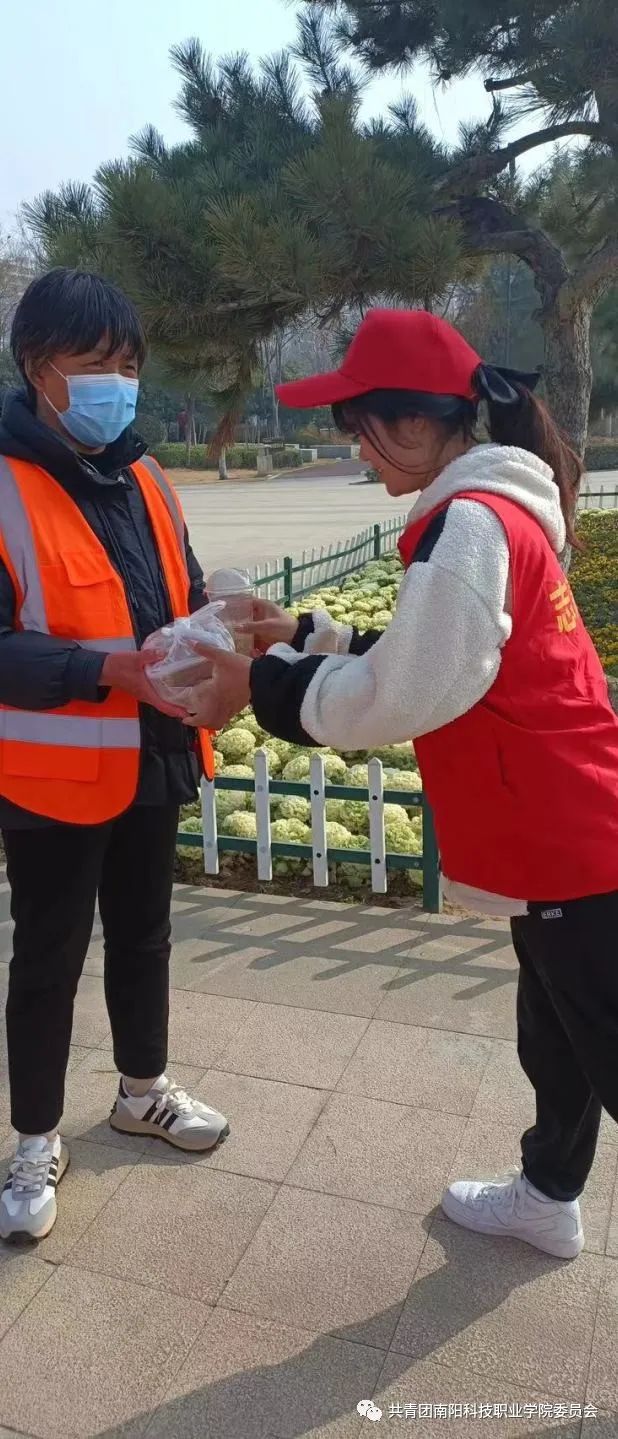 在抵达明珠湖后,现代服务管理学院团委书记吕泓杞代表志愿者向环卫工人送去真挚的关心和祝福。东城环卫所所长闫丽表示:南阳科技职业学院的学生是好样的,邓州人民以拥有这样一所职业院校而感到骄傲。随后志愿者们分工协作,向环卫工人送去糕点、饮品等并给予美好祝福,同时志愿者还分组帮助环卫工人打扫明珠湖卫生,维护美好环境。