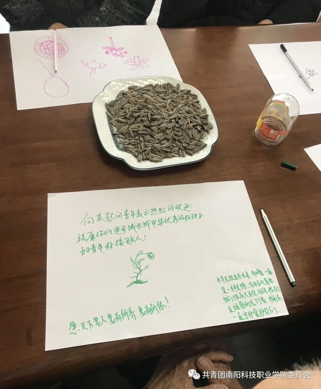 在绘画活动中,一位不爱说话的爷爷在纸上画下了生机勃勃的鲜花,寓意着朝气蓬勃的青年。在作品上方他表达了对同学们的欢迎,也给出了最真切的寄语,希望青年学生们好好学习,早日成长为祖国的优秀接班人。石子通同学郑重地在纸上写下对爷爷的回复,他承诺会和同学们一起为这些祖国的先行者持续送去关心和爱护,传递好尊老孝老敬老的传统美德,同时也祝愿天下所有老人老有所养,老有所依。