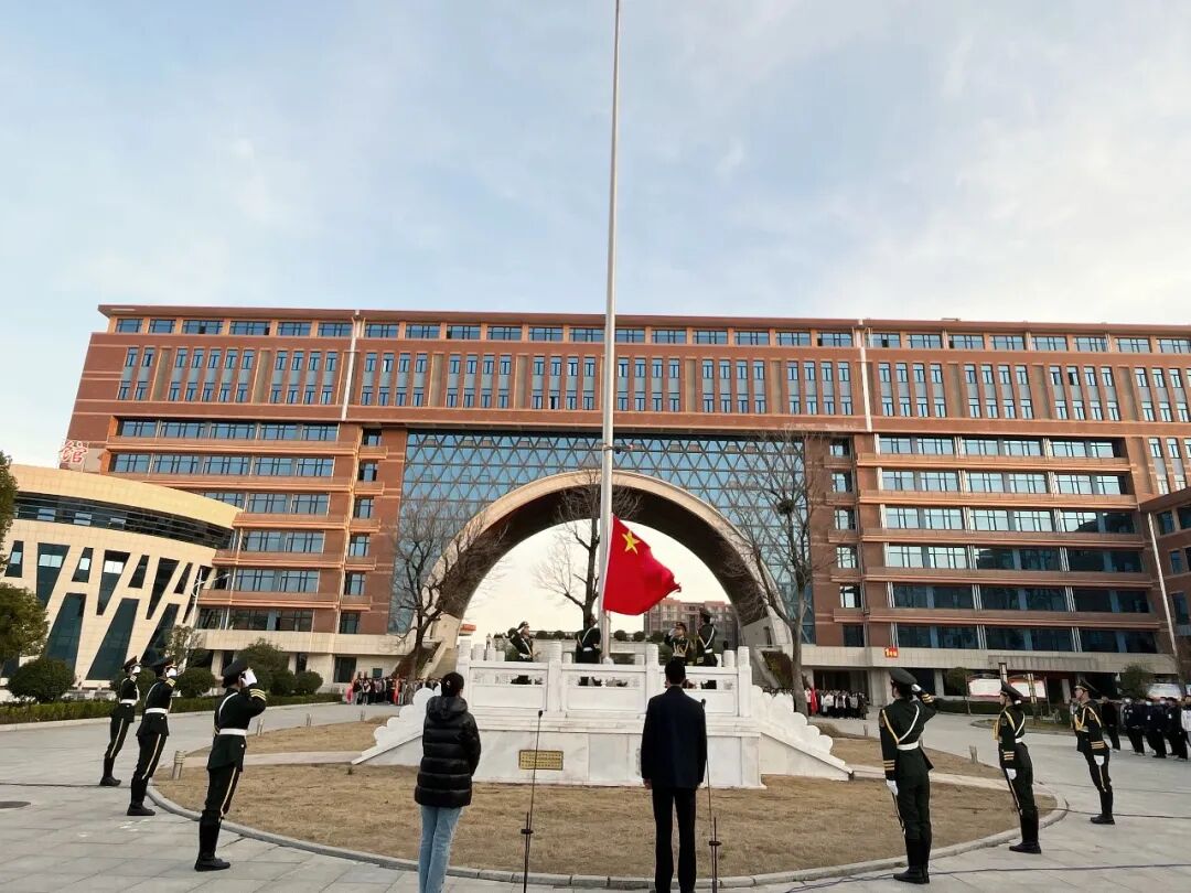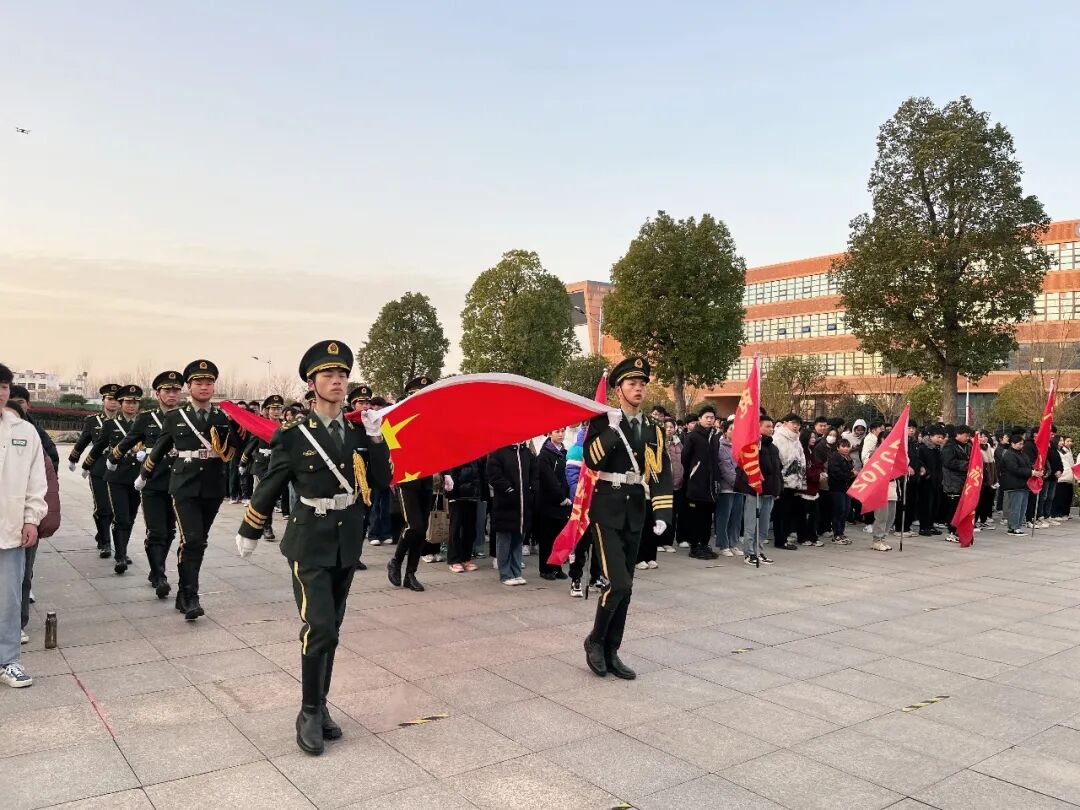 国旗护卫队队员迈着整齐划一、铿锵有力的步伐,护卫着鲜艳的五星红旗,昂首阔步入场走向升旗台。全体师生面向国旗肃立致礼。伴随着威武雄壮的《义勇军进行曲》,旗手振臂一挥,鲜艳的五星红旗徐徐展开,全体师生齐唱国歌,行注目礼,目视五星红旗冉冉升起,在熠熠晨光中迎风飘扬,爱国之情和强国之志在师生们心中激荡。