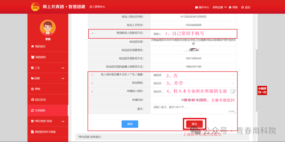 4.各位新生团员请将组织关系转接到录取院系专业所在班级团支部。直接转接到“南阳科技职业学院团委”的将会审批驳回,需重新申请。