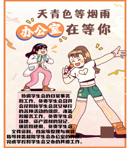 你可以自由挥洒你的才艺,你可以激扬文字,你可以醉心创作,宣传部是你的。舞台。宣传部是一个给你温暖与鼓励的大家庭,期待同学们的参与~