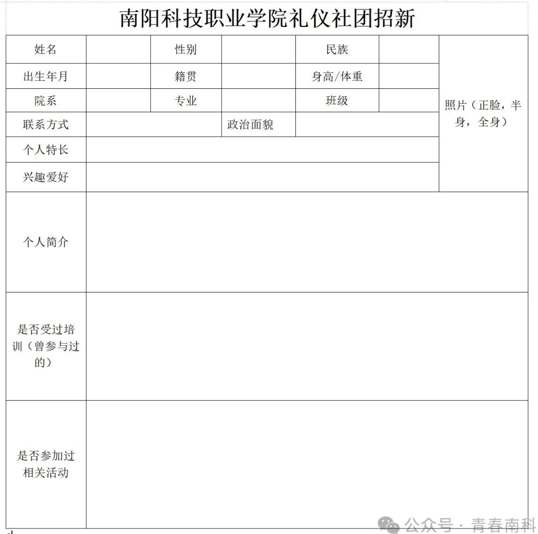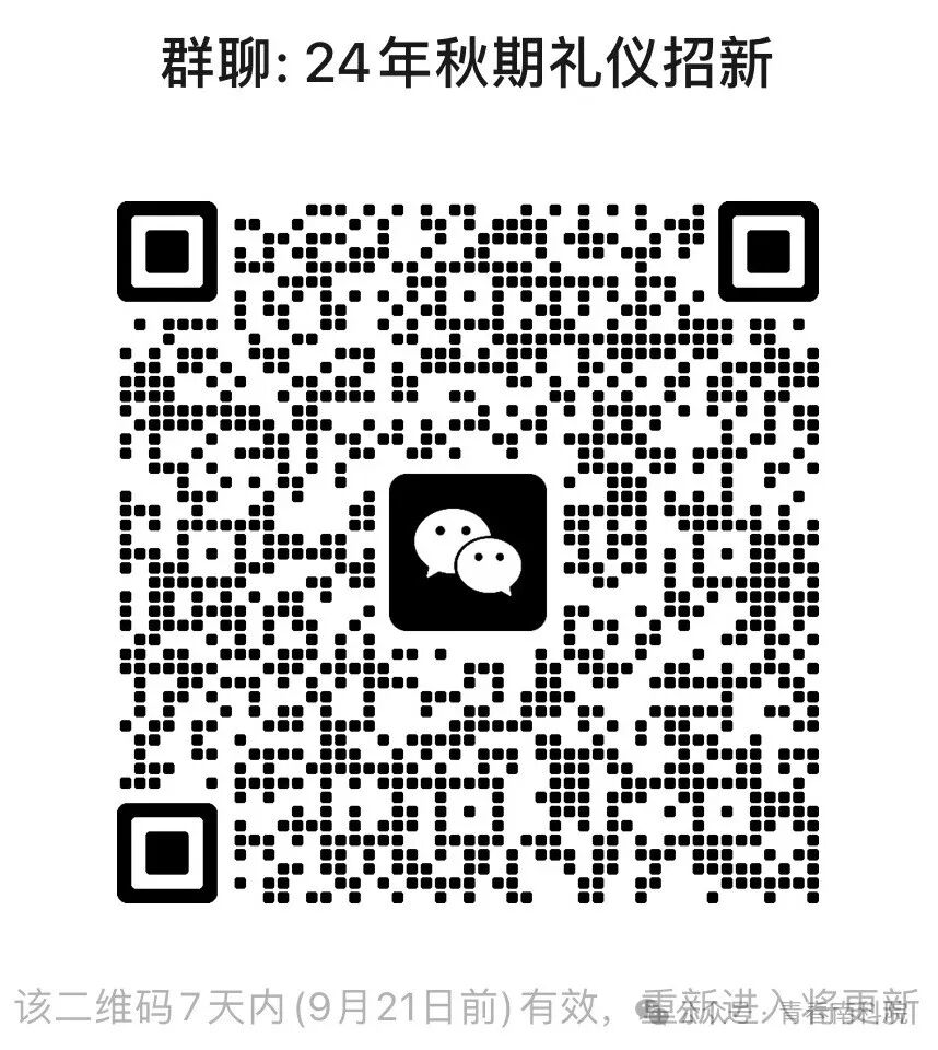 报名方式:微信扫描下方二维码进入招新群,自行填写电子版报名表,纸质版由同学们自行打印,周三下午四点前,上交至七号楼团委办公室7217。