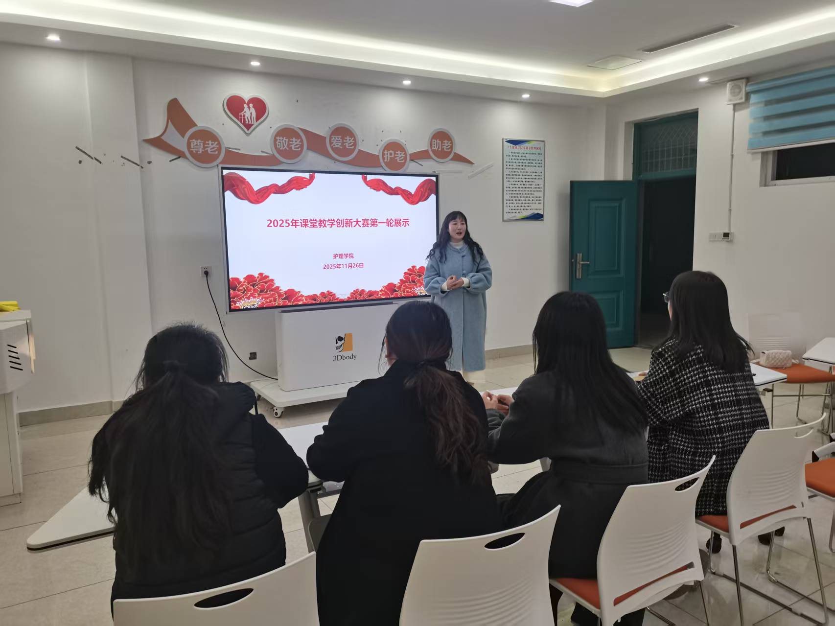 为深化课堂教学改革、践行“以学生发展为中心”的教学理念,全面提升教师课堂创新设计与实践能力,11月25 日,护理学院于 5104 教室组织2025年度校级竞赛参赛教师开展作品展示活动。
