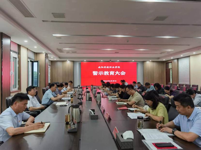 为强化警示教育,进一步推进党纪学习教育走深走实,5月29日下午,南阳科技职业学院在7号楼1号会议室召开警示教育大会,校党委书记卢明存主持会议并讲话。领导班子成员、支部书记、副书记、各部门负责人参加会议。