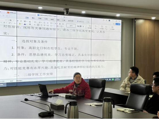 教务处闫冰老师在会上对关于选拔学生成立技能班备战高职各类比赛做了相关安排。她指出在技能培养方面,学校将实施"三位一体"模式,通过技能班建设、技能达标月活动和职教活动周展示,构建贯穿学期的技能提升链条。教务处将加强对各二级学院技能班组建、培训情况的定期检查,将检查结果纳入学院年度考核。