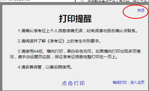 备注:(如果不能直接打印准考证的考生,单击“关闭 ”,可以采用微信截图,把准考证截图保存到手机上,去打印店打印)