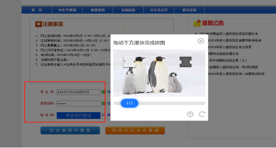 (1)输入考生号和登录密码,单击 “点击进行验证”,