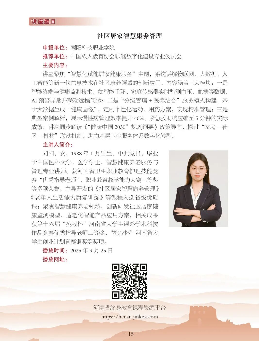 为深入贯彻落实党的二十大精神,进一步提升终身学习公共服务水平,建设人人皆学、处处能学、时时可学的学习型社会,中国成人教育协会开展了“2025年全民终身学习活动社会大讲堂”活动,我校《社区居家智慧康养管理》讲座将在河南省终身教育课程资源平台进行直播。