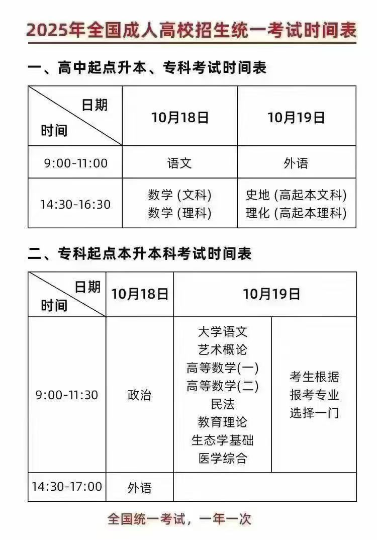 2025年成人高等学校招生全国统一考试将于10月18日至19日举行,请广大考生提前做好备考安排,合理规划时间,确保顺利参加考试。