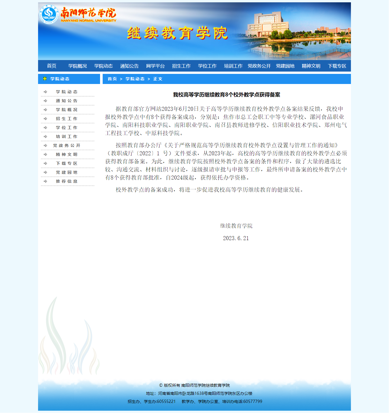 南阳科技职业学院继续教育学院自2004年与南阳师范学院继续教育学院合作办学以来,累计培养本、专科毕业生万余人,2023年教育部对高等教育教学点重新备案,南阳科技职业学院成为南阳师范学院继续教育学院在教育部备案的八所高等学历继续教育校外教学点之一,我们将以此为契机,加强两校间的学习交流,不断提升办学质量,为区域经济发展培养更多的优秀人才!
