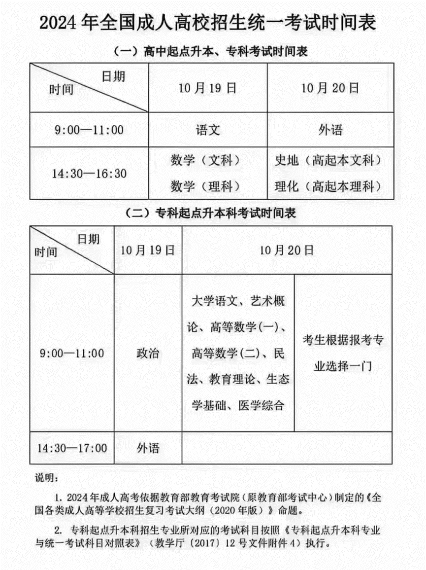 (2)考试时间:10月19-20日(附:2024年全国成人高校招生统一考试时间表)。