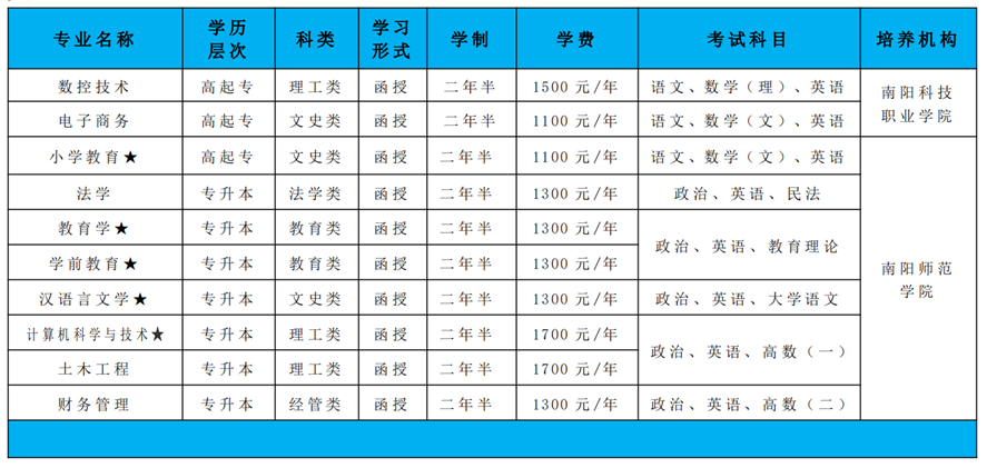 2.录取:我校严格执行招生录取政策规定,坚持公开、公平、公正原则,按照考生成人高考成绩由高到低择优录取,考生可于12月中旬登录“河南省教育考试院”网站查询录取结果,学校统一印制、发放录取通知书。