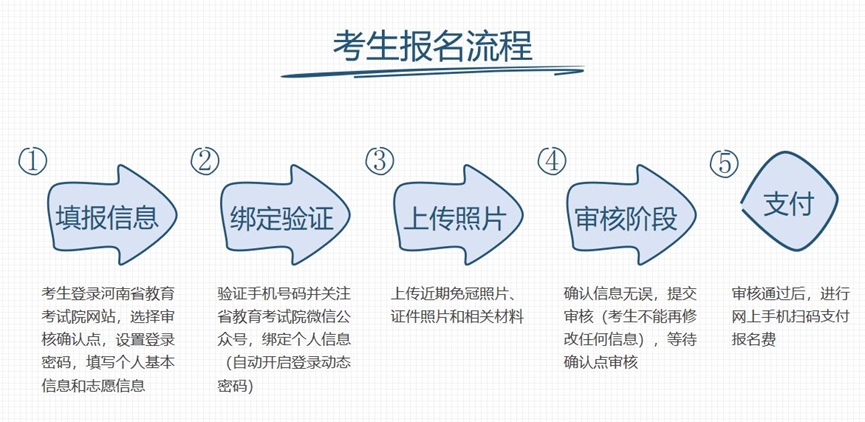 2.报名流程:登录河南省教育考试院网站,网址http://www.haeea.cn/,按提示填写个人信息和志愿信息(考生填报志愿时,只可填写一所学校一个专业志愿,我校招生院校代码为:490。)提醒各位考生务必完整、准确填报个人真实信息(通讯地址和联系方式等)。