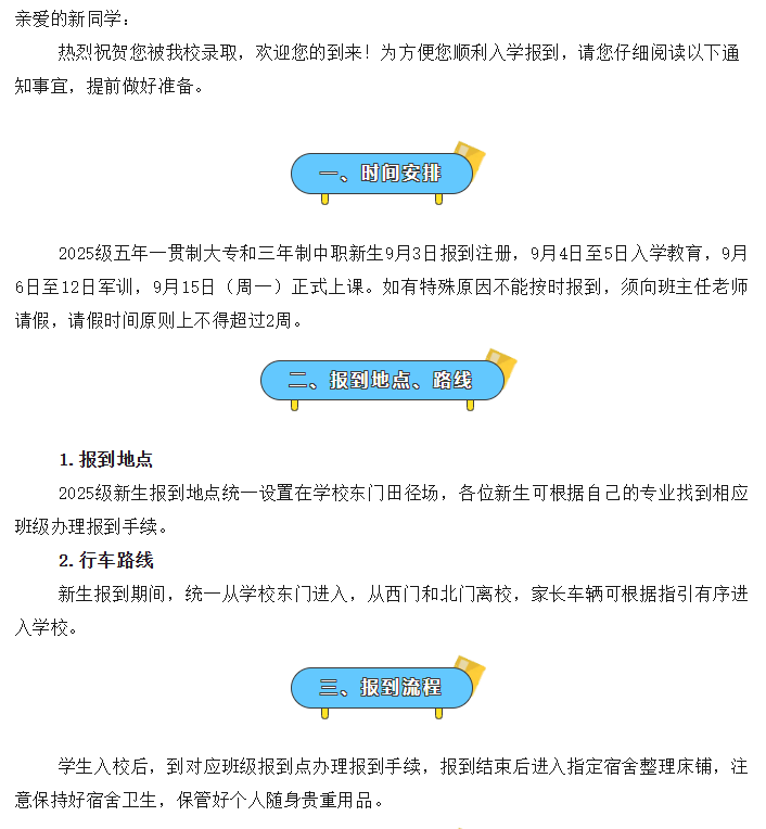 南阳科技职业学院2025级五年制大专和普通中专新生入学须知