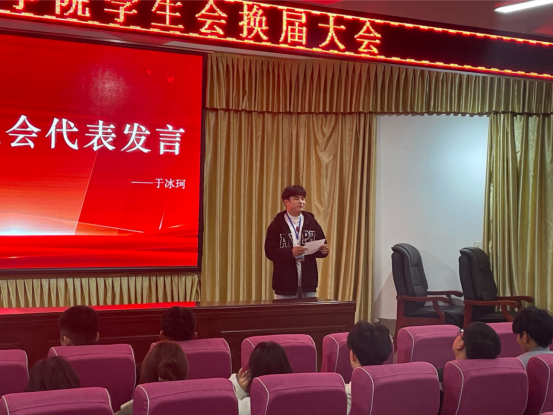 其次是学生会主席于冰珂的发言。他说到我们经历的每一件事都是我们大学乃至人生道路上的宝贵财富、警醒自己、审视自己,明记学生在前学生干部在后,牢记学生干部责任乃至使命所在。他表示,学生会是连接学生与学校的桥梁,希望新一届学生会能够继续发扬优良传统,为同学们服务,为学校发展贡献力量。于主席的这一发言得到了学生科老师们的好评,在座的各个学生会成员都受到了启发。
