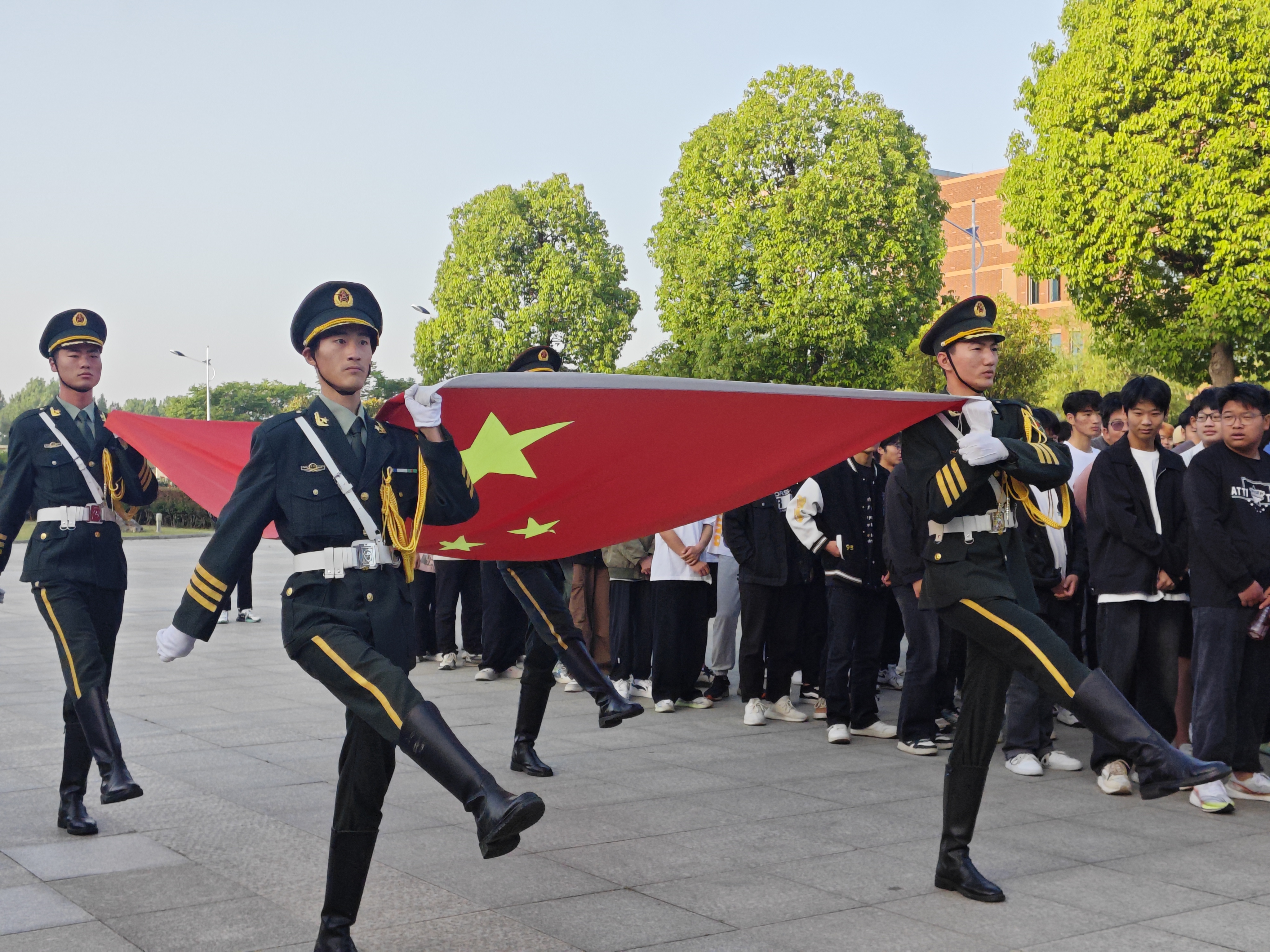 国旗护卫队的同学们迈着整齐划一、铿销有力的步伐人场,伴随着义勇军进行曲庄严的旋律,全体师生面对五星红旗行注目礼,以此表达对祖国的热爱与崇敬之情。
