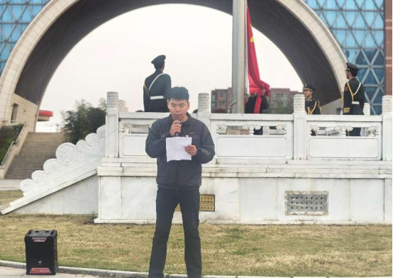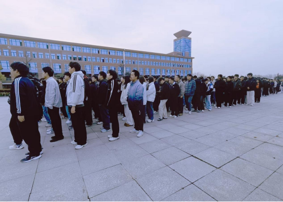 伴随着激昂的《分列式进行曲》,国旗仪仗队步伐整齐划一,护送国旗入场。全场师生庄严肃立,面向国旗行注目礼。五星红旗在晨光中熠熠生辉。全体人员神情肃穆,以最崇高的敬意向伟大祖国致以深情祝福。