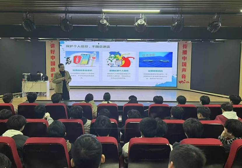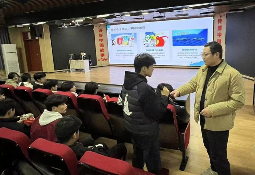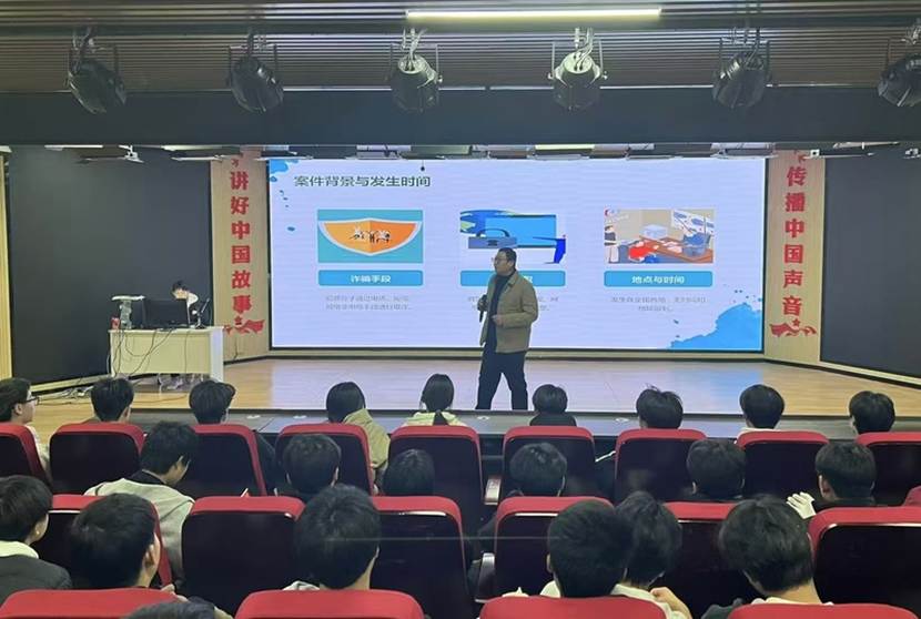 紧接着,他深入剖析了电信网络诈骗的本质,从“电”话诈骗与“信”用卡诈骗入手,逐层揭开各类诈骗手段的伪装与陷阱。他通过一系列生动详实的数据与引人入胜的案例巧妙地将复杂的诈骗案例转化为直观易懂的警示教育知识,引导同学们清晰地认识诈骗的手法与本质。他指出面对层出不穷的诈骗手段,同学们应增强自我防范意识,尤其在个人信息保护方面要格外小心,遇到可疑情况时,应及时与辅导员和家长沟通,切勿轻信陌生人的诱导。
