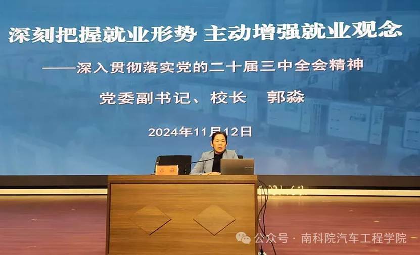 为深入贯彻落实党的二十届三中全会精神,充分发挥就业育人实效,11月12日下午,党委副书记、校长郭淼在星海艺术中心为汽车工程学院全体师生讲授“深刻把握就业形势,主动增强就业观念”主题党课,旨在帮助学生们深入了解当前的就业形势,树立正确的择业观、就业观。