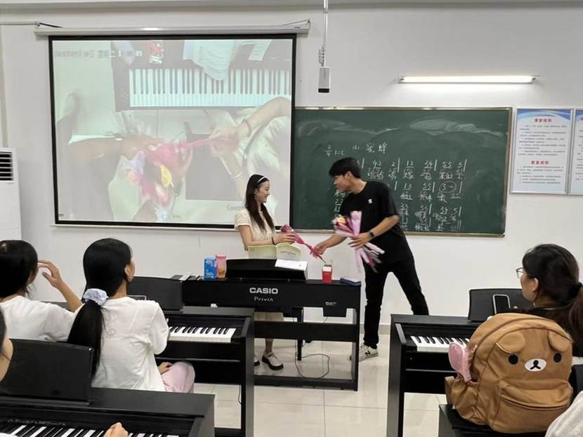 同学们满怀着敬意地将手中的花束递给老师时,脸上露出灿烂的笑容,鲜花代表了学生对老师的敬爱,校园里到处都是浓浓的师生情。