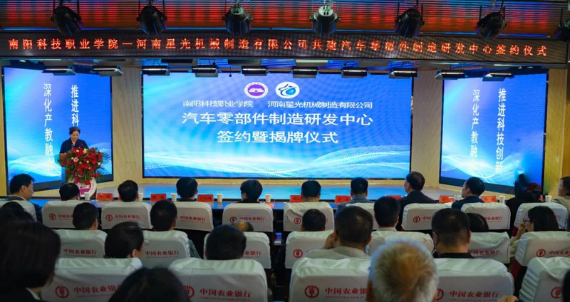 4月24日,我校与河南星光机械制造有限公司在北区报告厅举行校企共建汽车零部件研发中心合作签约暨揭牌仪式。邓州市政协副主席刘红彬,邓州市先进制造业开发区党工委书记、管委会主任赵明辉,邓州市科工信局党组书记吕忠山,邓州市科学技术协会党组书记赵鹏,河南星光机械制造有限公司总经理李达,我校党委书记卢明存、校长郭淼及领导班子成员出席签约暨揭牌仪式,学校各处室负责人、智能制造学院及汽车工程学院师生代表共计300余人参加了本次活动,仪式由郭淼主持。