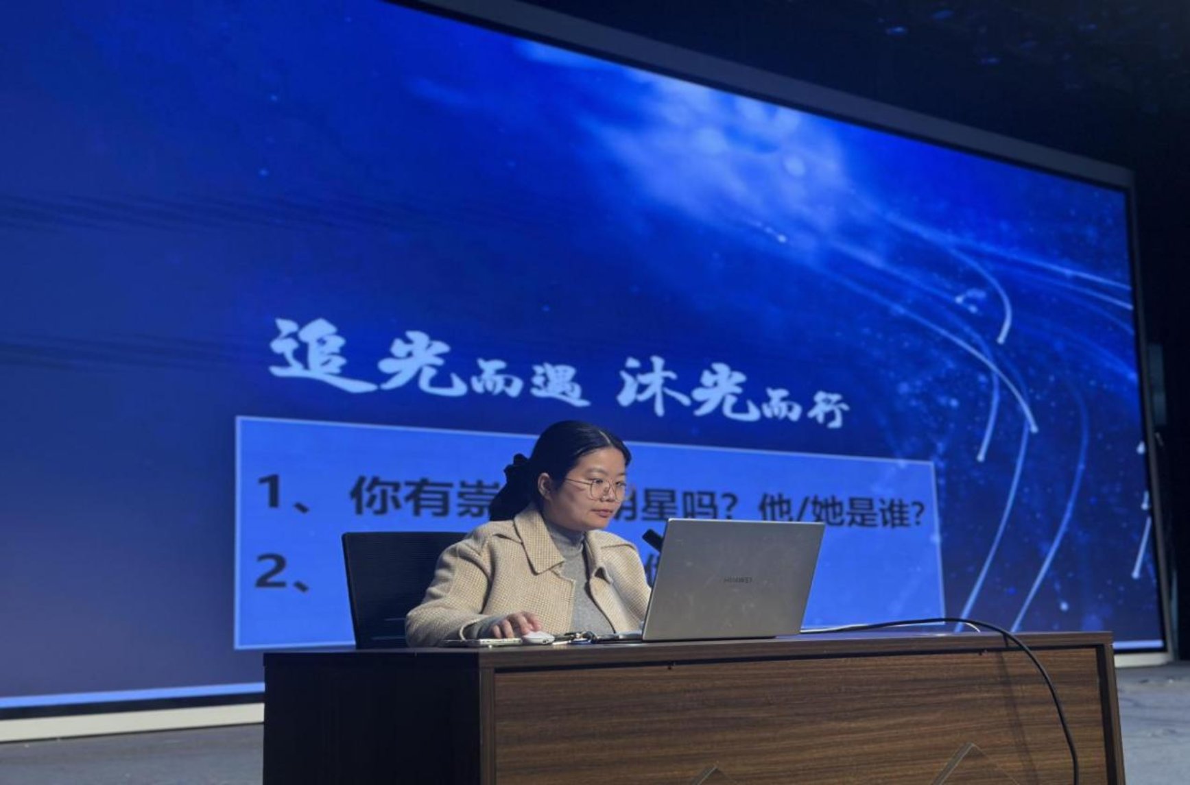 活动中,师生先围绕“追星”话题互动,分享喜爱的舞台或屏幕形象后,大家共同聚焦中国科技工作者——黄旭华、邓稼先、袁隆平仁东等国之脊梁,通过他们的故事让学生明白,经得住时间沉淀的“星光”源于“以身许国”,也激励大家在自身领域做“点亮自己”的微光。