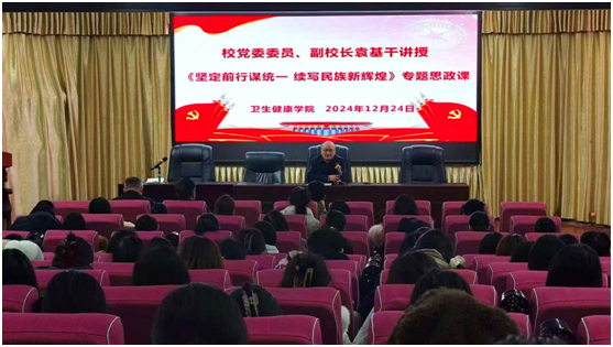 为深化师生对两岸关系及祖国统一大业的认识,激发师生的爱国热情与民族自豪感,12月24日下午4时,校党委委员、副校长袁基干以《坚定前行谋统一 续写民族新辉煌》为题,在三师苑一楼报告厅讲授思政课,党委委员、副校长刘彦、卫生健康学院师生代表参加了本次活动。