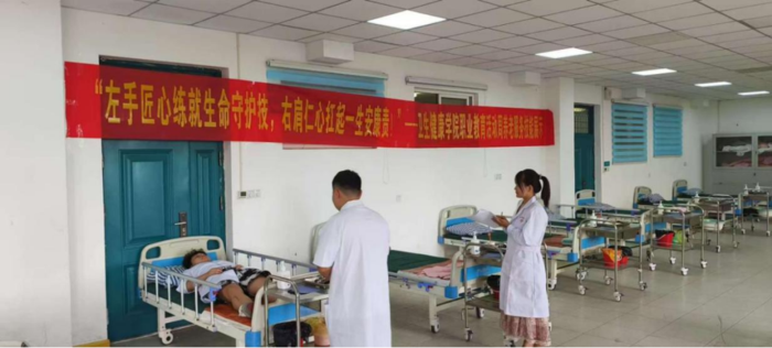 活动现场,“左手匠心练就生命守护技,右肩仁心扛起一生安康责”、“智启康复新篇,技展职业风华”等标语振奋人心,中医推拿、现代康复、老年照护、铺备用床、静脉输液等核心技能考核有序开展。