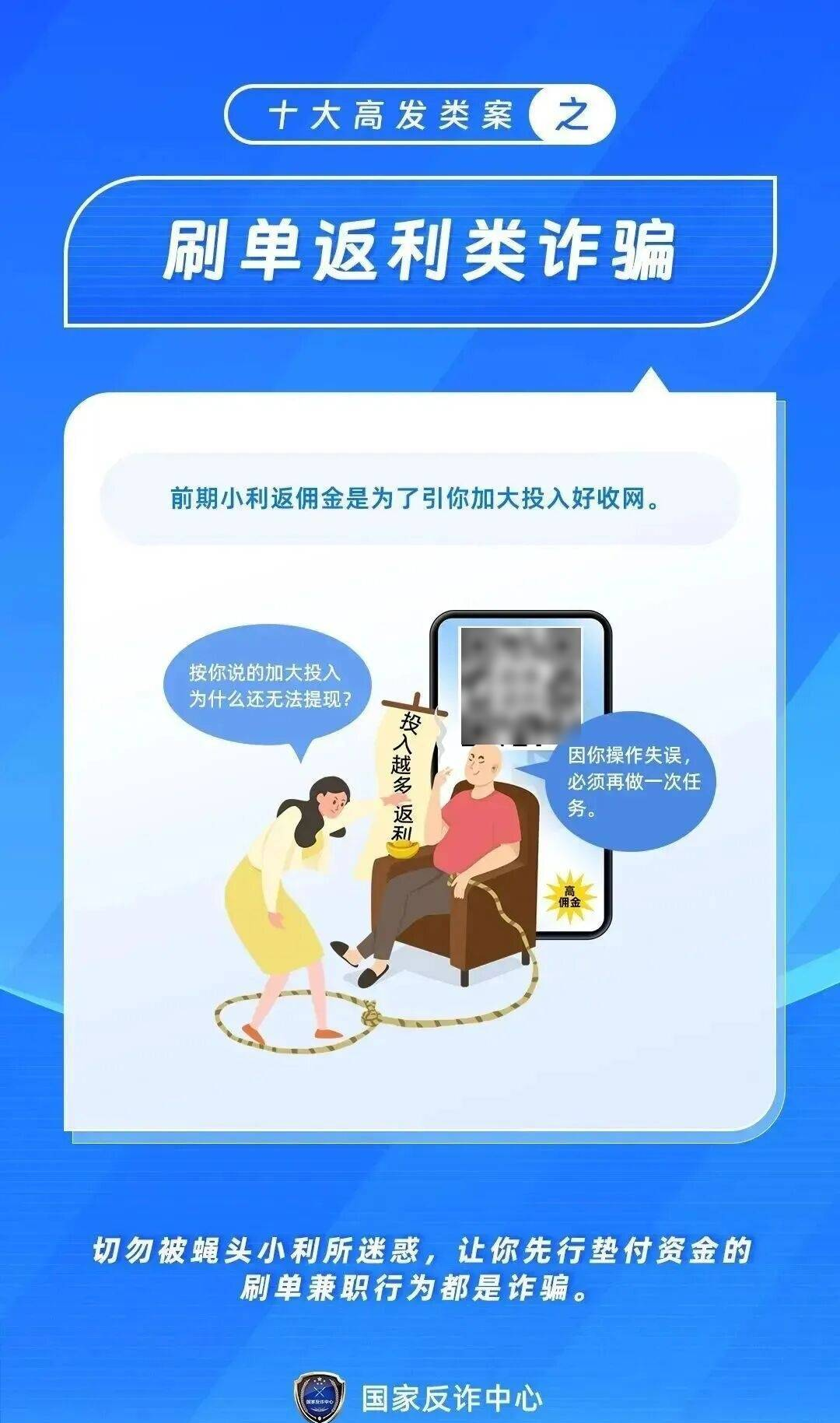 寒假是大学生兼职的高峰期,诈骗分子利用部分同学想“赚零花钱”的心理,在微信群、朋友圈、兼职APP上发布“日入300+”“简单操作、无需经验”“刷单返利”“打字录入员”等诱人信息。初期,他们可能会通过小额返利获取信任,当你投入更大金额后,便以“任务未完成”“需要充值解冻”“缴纳保证金”等理由拒绝提现,甚至直接拉黑消失。