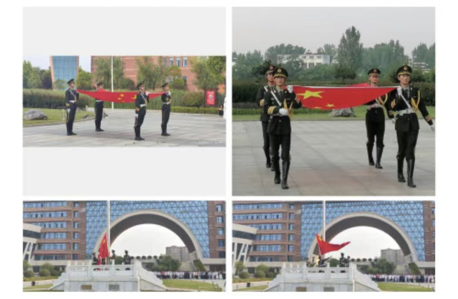 国旗护卫队迈着整齐划一、铿锵有力的步伐,护送着五星红旗正步走向国旗广场。全体师生精神饱满,面向红旗,行注目礼。随着激昂的《义勇军进行曲》响起,全体师生奏唱国歌,共同注视五星红旗冉冉升起,在熠熠生辉的晨光中迎风飘扬!