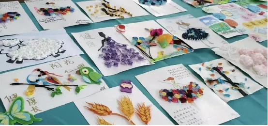 折纸展区更是一片五彩斑斓的艺术天地。手工花朵造型逼真、品种繁多,娇艳的玫瑰、纯洁的百合、灿烂的向日葵等,每一朵都凝聚着创作者的心血。同学们巧妙运用不同材质的纸张、布料,通过折叠、剪裁、粘贴等多种工艺,赋予了花朵鲜活的生命力。剪纸作品线条流畅、图案精美,传统的吉祥纹样、生动的人物故事跃然纸上,展现出中华传统文化的独特魅力。贴画作品则充满童趣与创意,利用树叶、纽扣等生活中常见的材料,拼贴出一幅幅充满故事性的画面,让观赏者感受到艺术与生活的紧密结合。