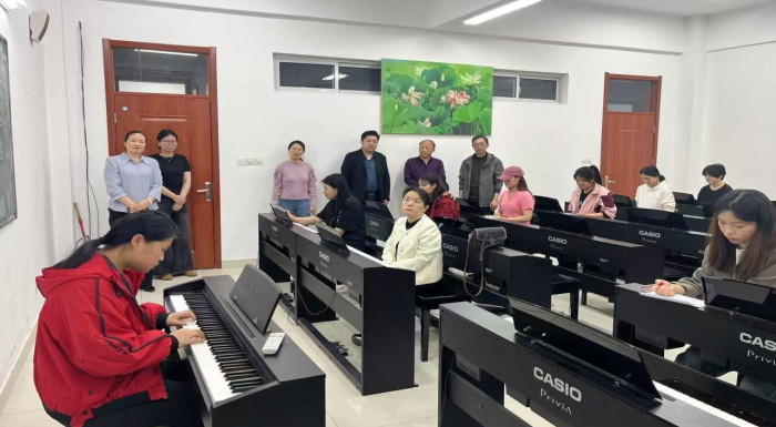 弹唱和声乐模块测试同样精彩。学院特邀人文艺术教育学院的刘海洋副院长担任点评与指导嘉宾。刘海洋副院长凭借深厚的专业造诣,对学生们的技能表现进行了细致剖析。他表示:“在弹唱配合方面,部分同学已经做到了节奏协调,但在音色控制与情感表达上,还可进一步挖掘歌曲内涵,赋予演唱更丰富的情感层次。声乐演唱中,同学们要注重发声技巧的运用,打开共鸣腔体,让声音更具穿透力与美感。” 刘副院长的指导高屋建瓴,为学生在音乐技能提升上开拓了新思路。
