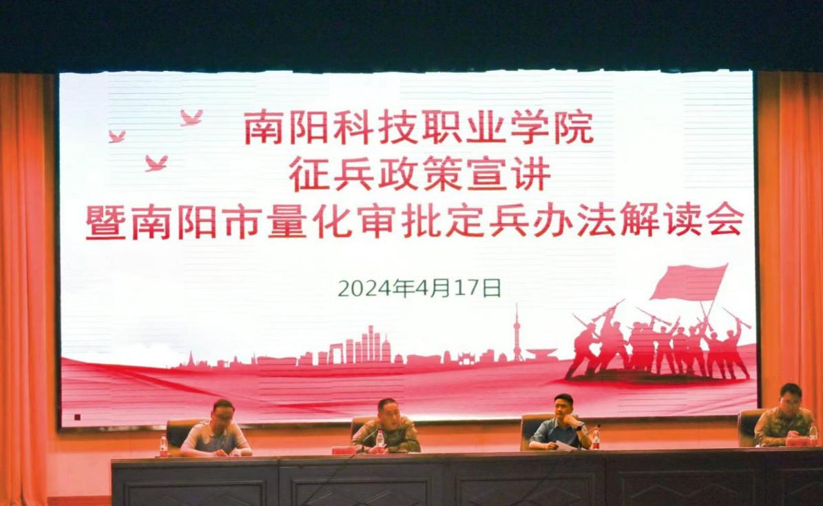 为进一步响应国家"强国强军"号召,扎实做好大学生征兵工作, 2024年4月17日下午,学校2024年下半年征兵政策宣讲暨南阳市量化审批定兵办法解读会在学术报告厅举行。大会邀请邓州市人武部保障科科长黄俊雷、助理孙毅到会宣讲。学生处处长贺翔、副处长辛鑫以及各学院征兵专干、全体高职辅导员参加了本次会议。会议由辛鑫主持。
