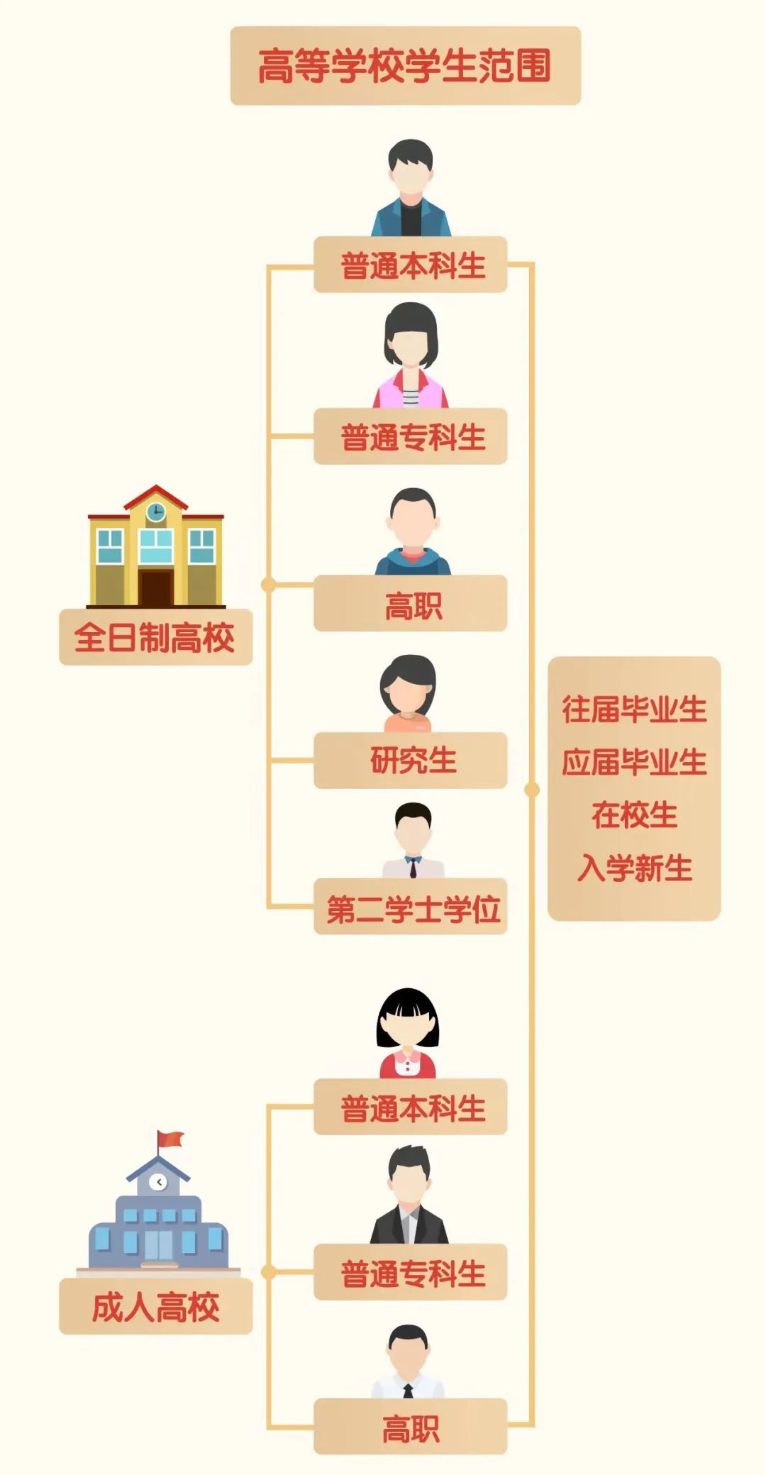 2)成人高校招收的全日制普通专科(含高职)、本科的毕业生、在校生和入学新生。