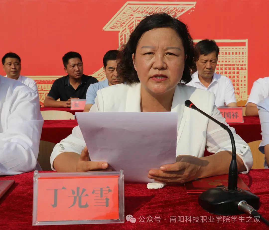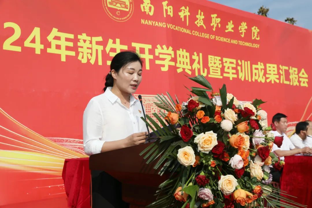 党委委员、副校长丁光雪宣读《南阳科技职业学院关于表彰2024级军训先进营、内务标兵宿舍、优秀军训教官、优秀指导员、军训标兵的决定》