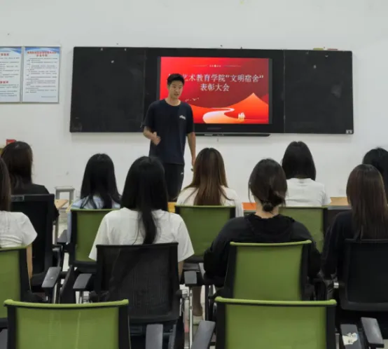 为营造整洁、温馨、积极向上的宿舍文化氛围,表彰先进典范,推动校园精神文明建设,人文艺术教育学院于2025年6月18日下午在1313教室举行2025年度“文明宿舍”表彰活动。学院自律委员会学生干部代表、文明宿舍学生代表共同参与,活动现场气氛热烈,展现了学子们良好的精神风貌。