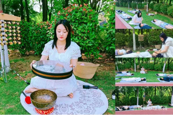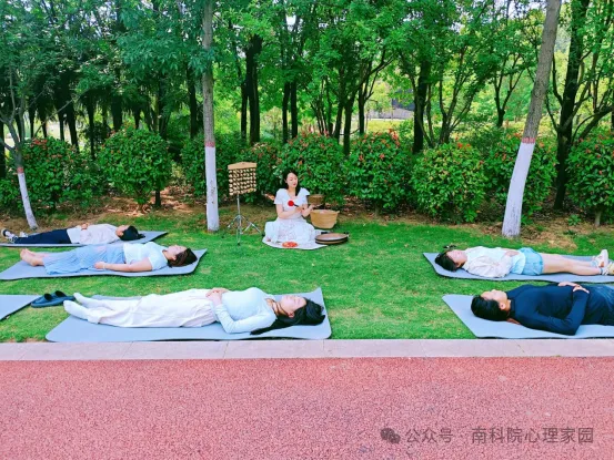彭老师执起鎏金钵槌,在尼泊尔颂钵边缘画起完美弧线。当第一声音符漾开,空灵声波与湖面涟漪共振升腾,浪涛鼓模拟的海浪声由远及近,果壳铃摇曳出山涧清泉的脆响。学生们闭目仰卧于芳草地,在“深呼·慢吸”的引导中,感受声波振动如涟漪漫过全身,焦虑指数随着共振频率逐渐归零。
