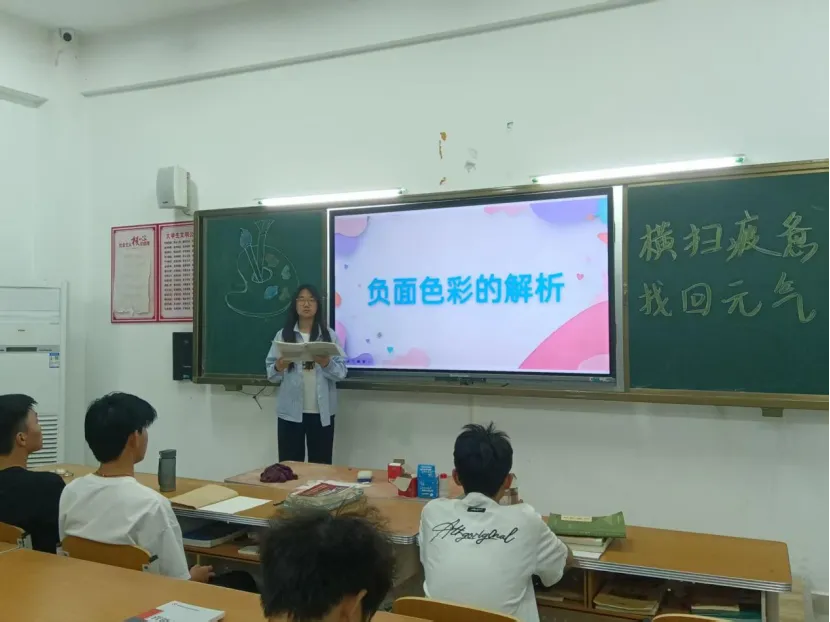 在“负面色彩的解析”环节,各班心理委员们都深入剖析了黑色、灰色等色彩在情绪表达中所代表的负面意义,引导大家正视生活中的消极情绪,鼓励同学们积极应对,不要轻易被负面情绪影响。