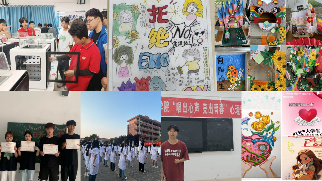 各二级学院深入挖掘专业中的心理育人元素,进一步探索多元化心理健康教育活动模式,开展“心言传递,E语成真”心理健康知识宣传手册设计大赛、“大国工匠,‘智’随心动”3D打印体验活动、“绘出心声,思绪飞扬”涂鸦绘心声活动、“巧手慧心,向阳而生”创意环保手工设计大赛、心理推文征集、“运动与健康-快乐八段锦”健心活动、“唱出心声,亮出青春”心理歌曲大赛等各类特色活动12项,丰富了学生的精神世界,促进了学生之间的情感交流,学生的创造力、审美能力、动手能力和心理调适能力进一步提升。