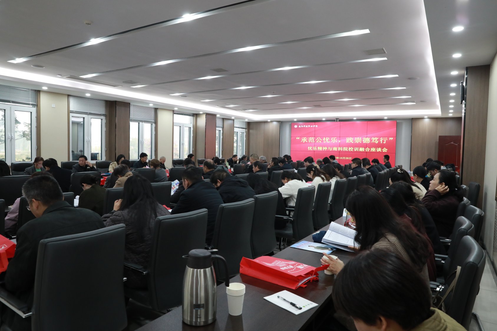 10月28日上午,“承范公忧乐,践崇德笃行—忧乐精神与南科院校训融合”座谈会 在学校智圣楼一号会议室召开。15名范仲淹文化研究会代表结合自身实践,分享了对忧乐精神与校训融合的思考,凝聚“以精神育人、以行动践诺”的共识。