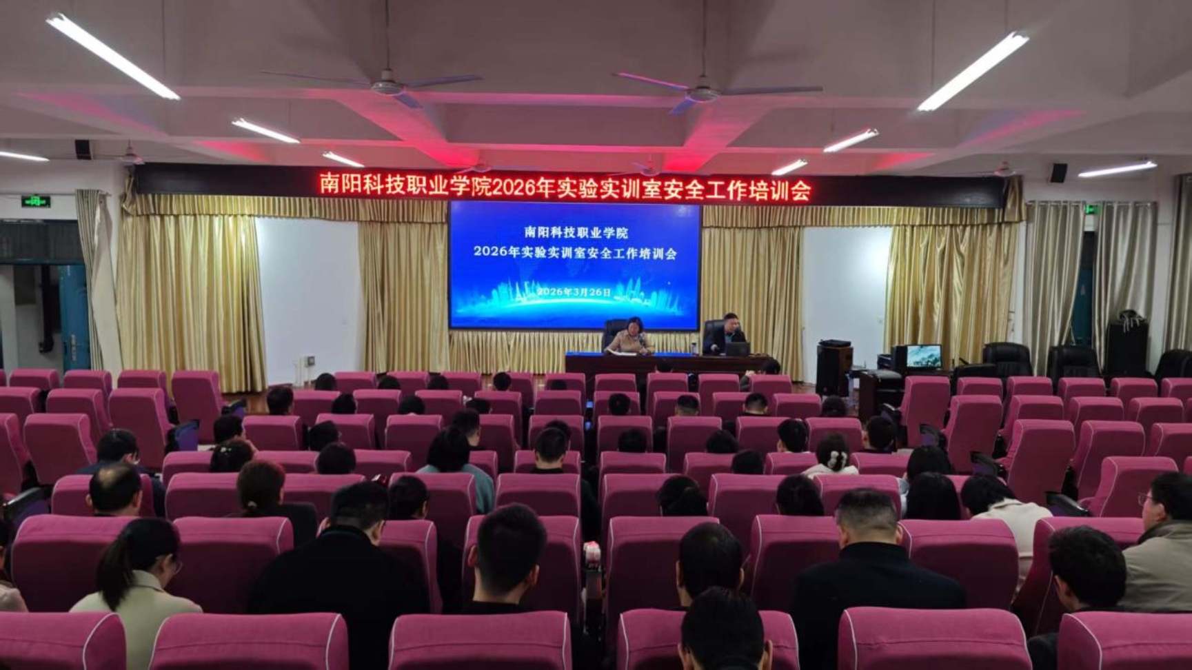 为进一步规范实验实训室管理,压实安全工作责任,防范化解各类安全风险,以实际行动树立和践行正确政绩观,3月26日下午,我校在三师苑报告厅召开实验实训室安全工作培训会。纪委书记张定群、副校长丁光雪,相关职能部门负责人、各二级学院院长、党支部书记、分管教学副院长及全体实验实训室管理员参加会议。
