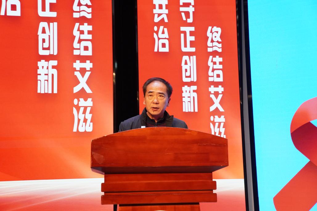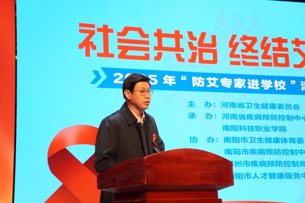 南阳市卫健体委疾控科科长曾保栓在讲话中以南阳市青年学生感染人数为例向同学们强调青年学生应树立“自身健康第一责任人”意识,主动学习防艾知识,自觉遵守性道德,并积极参与校园防艾宣传,成为防治工作的重要力量。他表示,此次活动将有效提升师生的防艾意识和能力,对遏制艾滋病在青年中的传播具有积极作用,并呼吁社会各界携手努力,共同筑牢防艾屏障,为推进健康中国建设贡献力量。