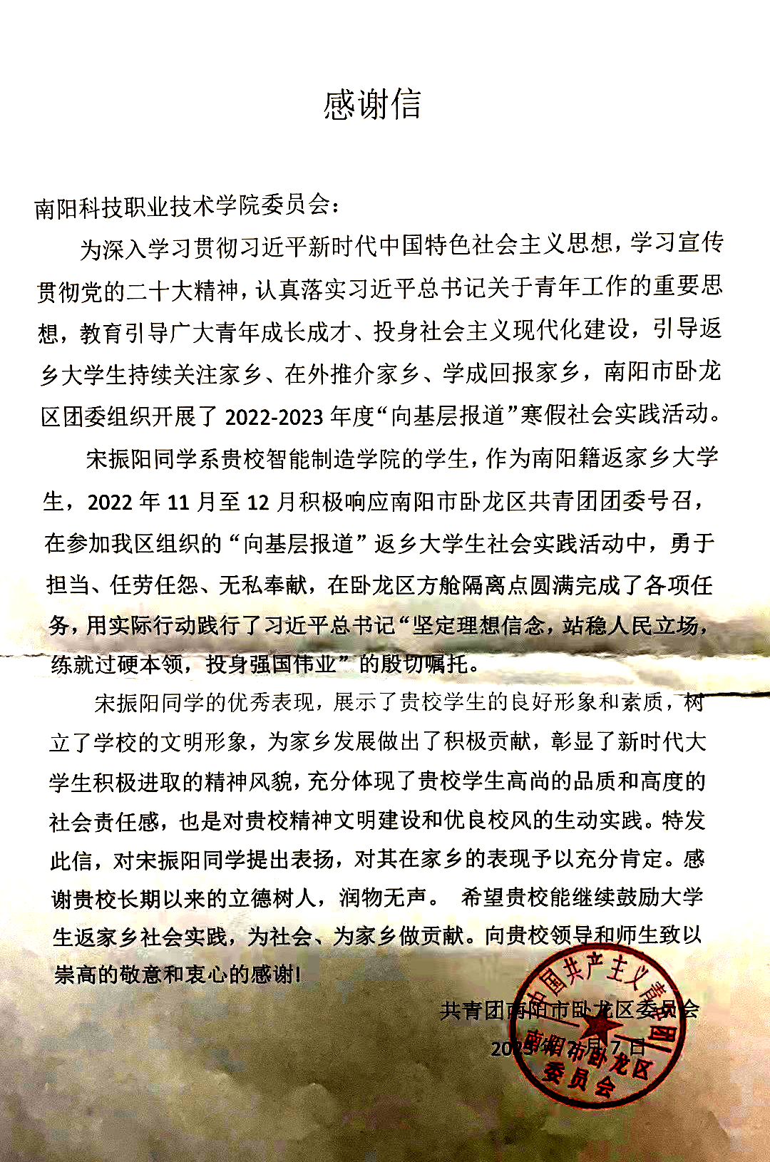 近日,我校收到一封来自共青团南阳市卧龙区的一封感谢信,信中对我校大一新生宋振阳同学,在南阳卧龙第一完全学校第四方舱隔离点中的无私奉献行为表示赞扬与感谢。