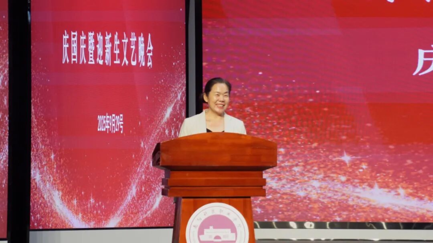 校长郭淼在晚会上向全体师生致以节日的诚挚问候,特别对怀揣梦想、跨越山海加入南科院大家庭的新生们表示最热烈的欢迎。站在历史与未来的交汇点,她与同学们分享三点期望:一要心存高远、找准人生目标。将小我融入大我,以抗战精神砥砺家国情怀;二要精心治学、练就过硬本领。谨记校训,传承好“乐学善思,精技强能”学风,在实训实践之中锤炼技能;三要坚持运动、强健青春体魄。走出宿舍、走向操场,以汗水铸就意志,以运动涵养心性。