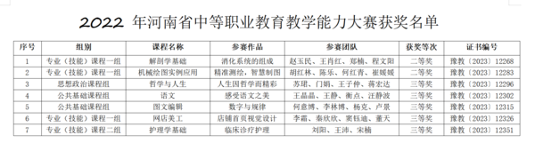 根据《河南省教育厅关于公布2022年河南省中等职业教育教学能力大赛获奖名单的通知》(教职成〔202326号),我校推荐的教师团队参赛作品荣获佳绩。其中,赵玉民、王肖红、郑楠、程文阳团队的《消化系统的组织》和胡红林、陈乐、何红青、崔媛媛团队的《精准测绘,智慧制图》荣获专业(技能)课程一组的二等奖;苏珺、门娟、王子仲、蒋宏达团队的《人生因哲学而精彩》荣获思想政治课程组的三等奖;何意博、李林博、杨克、卢景团队的《数字与规律》和王晶晶、王静、衡点、汪静波团队的《感受语文之美》荣获公共基础课程组的三等奖;李霜、秦欣欣、窦钰迪、董天团队的《店铺首页视觉设计》荣获专业(技能)课程一组的三等奖;刘阳、王沛、宋楠团队的《临床诊疗护理》荣获专业(技能)课程二组的三等奖