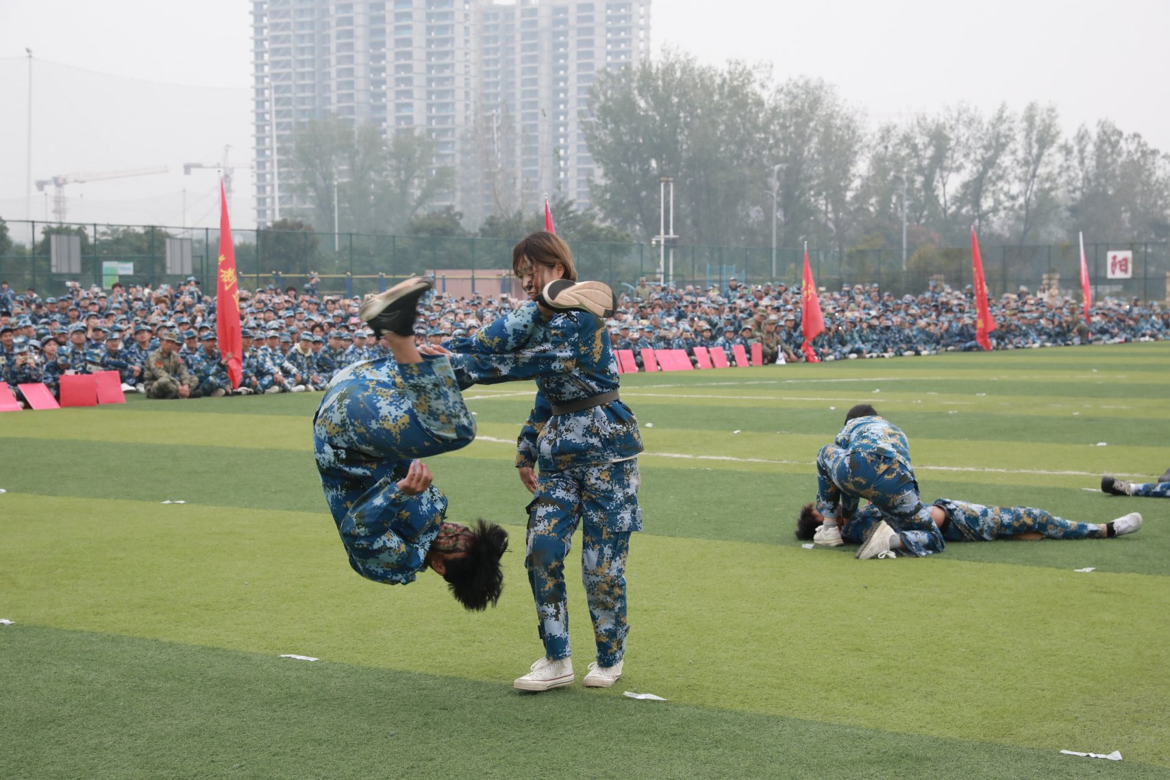 在庄严激昂的国歌声中,2025级新生军训汇报表演正式拉开帷幕。各新生连精神饱满、军容严整、士气高昂,踏着强有力的步伐、响亮的口号依次通过主席台接受检阅。战术表演环节,同学们在教官的指导下,模拟实战场景,迅速制伏目标、救护伤员,展现了精湛的协同作战素养与救死扶伤的医者使命。