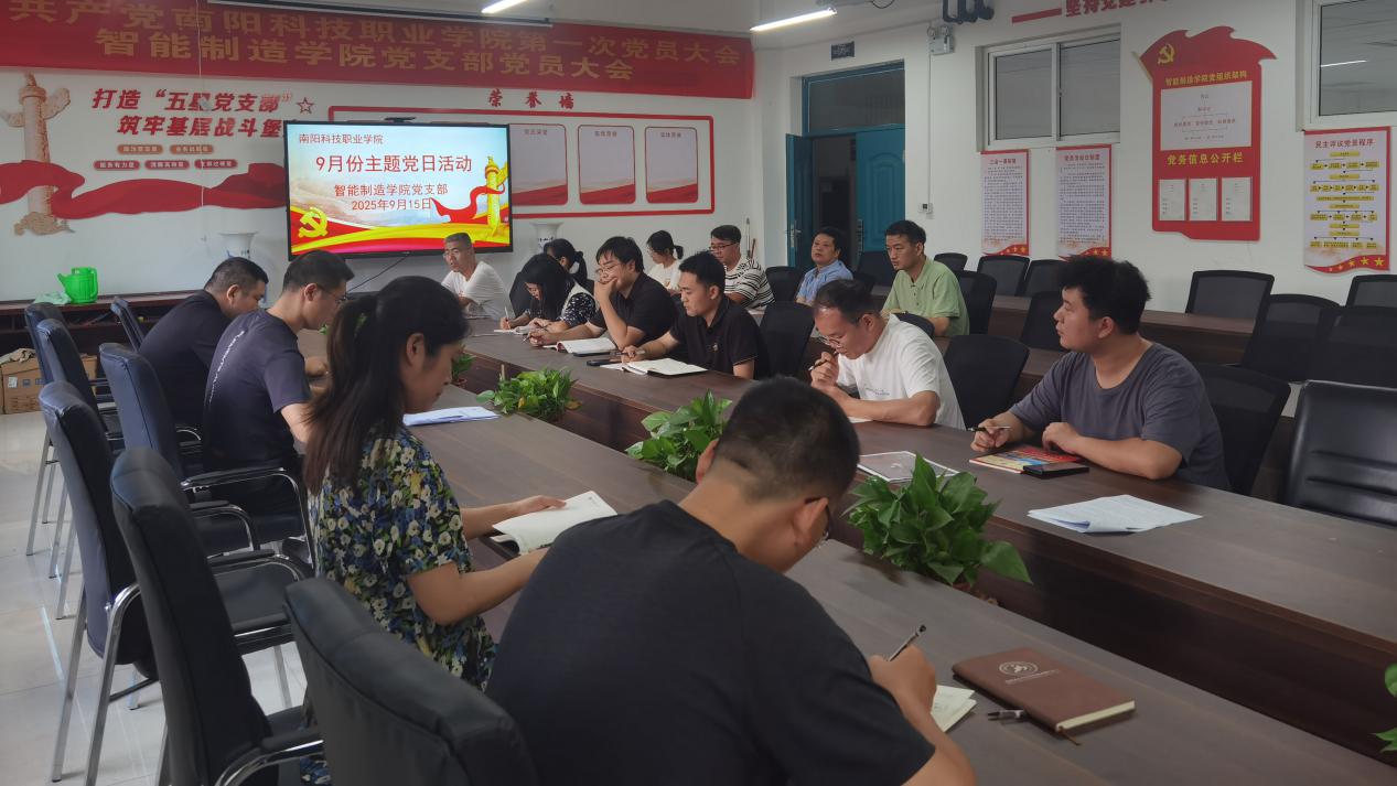 2025年9月15日,智能制造学院党支部在621发布并关闭5党员活动室召开了9月份主题党日活动,由党支部副书记赵钦主持,支部全体党员参加。