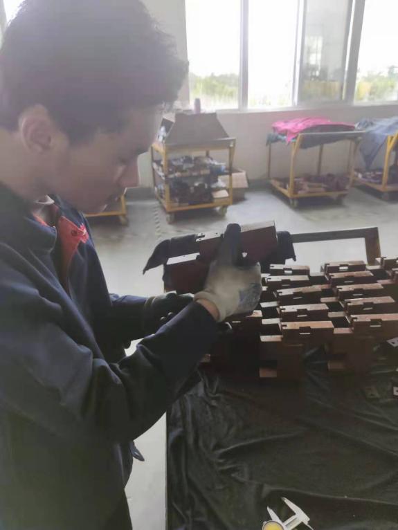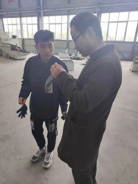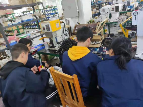 装配师傅在教学员对端子线束进行进一步加工。
