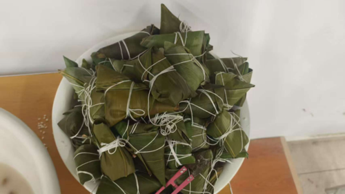 活动现场,王红艳老师与提前培训的学生“小老师”示范包粽步骤:折粽叶成漏斗状、填糯米红枣、压实捆绳……同学们围站四周,手持粽叶跃跃欲试。“老师,我的粽叶总漏米!”“要把绳结打在侧面才牢固。”在互动教学中,同学们逐渐掌握技巧,歪歪扭扭的粽子里盛满欢声笑语。事后来自很多同学朋友圈展示成果:“第一次包粽子,虽然样子不太好,但闻到粽香就觉得超有成就感!”
