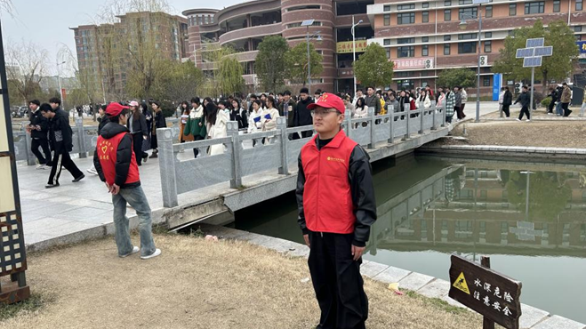 与此同时,在“文明岗位”的环节中,志愿者们还承担起了校园内多个重要地点的站岗任务,比如图书馆、教学楼入口等地。他们不仅协助维持了这些区域的公共秩序,还在岗位上提供了必要的信息指引和服务帮助,如解答路线咨询、指导如何正确使用自助设备等。